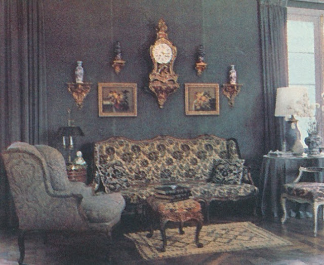 Now that I've gotten that off of my chest, I'll get on with the gist of this blog post. The upper Westchester County, New York house you see here belonged (or, perhaps still belongs) to designers Benjamin Garber and William Kennedy of William Kennedy Associates. Built in 1968, the 7,000-square-foot house was composed of quite spacious rooms, which were decorated in that dignified style so characteristic of mid-twentieth-century, high-end design. By dignified, I mean that the house was appointed with fine fabrics, formal, antique furniture, and exquisite porcelains, all set against a backdrop of sophisticated, harmonious color. And although the house could be deemed polite (a compliment in my book,) there is nothing stuffy about this house. Warmth and comfort are much in evidence, with just enough dazzle to keep things interesting.