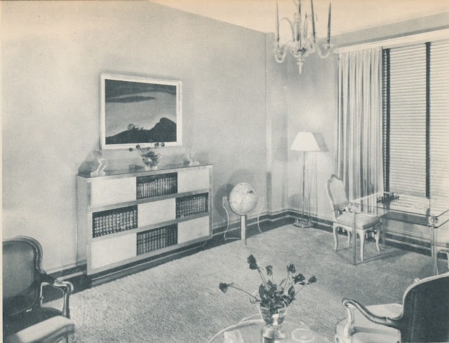 A room at what I believe was the Paris Exposition. Everything one could want for a night of entertainment was here, including a card table and, as Genauer made an effort to point out, a ledge at the base of the bookshelf on which one could display a lamp and smoking accessories.